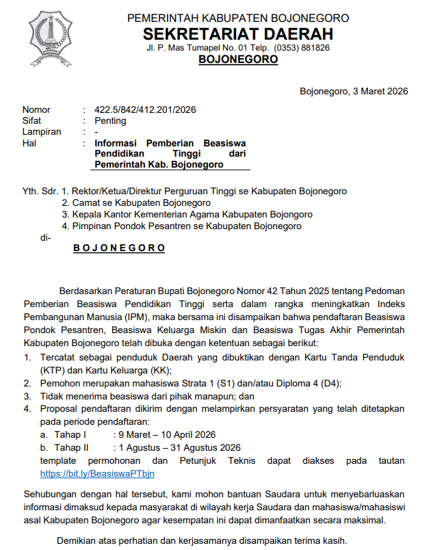 Kabar Gembira! Pendaftaran Beasiswa Pendidikan Tinggi Kabupaten Bojonegoro 2026 Telah Dibuka 🎓✨Pemerintah Kabupaten Bojonegoro kembali membuka kesempatan bagi putra-putri daerah untuk mendapatkan Beasiswa Pendidikan Tinggi....